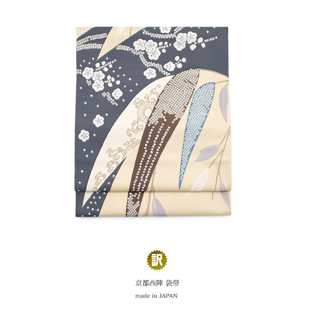 訳あり 袋帯 未仕立て 薄茶色 ベージュ 青灰色 竹 梅 菊唐草 京都西陣織 六通柄 フォーマルカジュアル 日本製