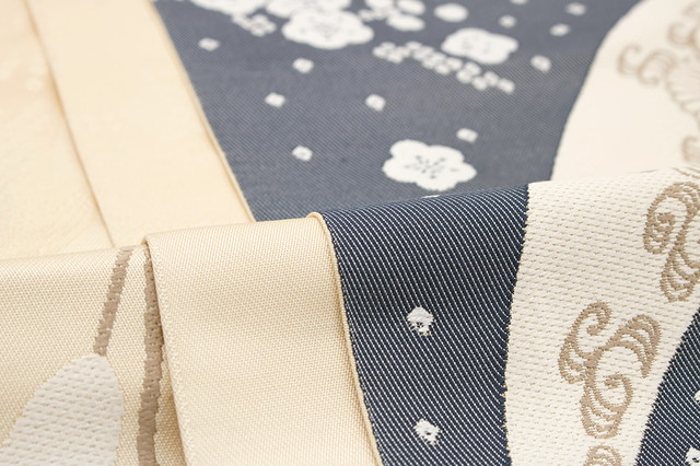 ふんわりと暖かな色合いの生地に、大胆に竹や梅花文、菊唐草が織り込まれた、粋で華やかなデザインです。