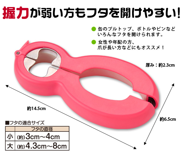 ビンやペットボトル、缶のプルトップなどいろんなフタをラクに開けられます!