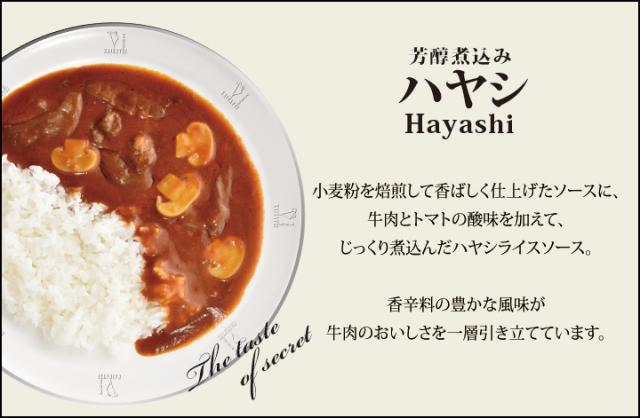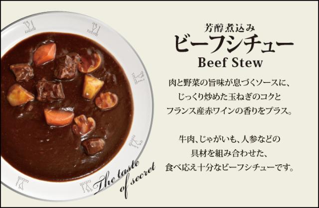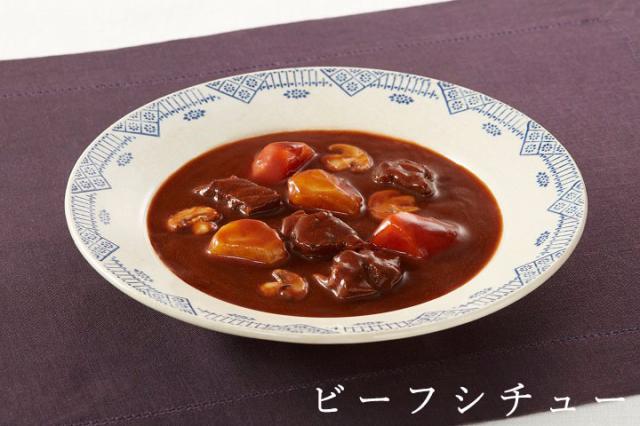 ] ・ビーフシチュー[牛肉(オーストラリア)、野菜(人参、じゃがいも)、食用油脂、マッシュルーム、トマトペースト、ビーフ風味調味料、ブラウンルー、 ソテーオニオン、赤ワイン、砂糖、ウスターソース、チキンエキス、オニオンペースト、乳等を主要原料とする食品、 食塩、ハチミツ、ガーリックペースト、ビーフエキス、香辛料、蛋白加水分解物/増粘剤(加工でんぷん)、着色料(カラメル)、 調味料(アミノ酸等)、香料、(一部に乳成分・小麦・大豆・牛肉・豚肉・鶏肉・ゼラチンを含む)] ・ハヤシ[牛肉(オーストラリア)、玉ねぎ、トマトケチャップ、マッシュルーム、トマトペースト、小麦粉、食用油脂、砂糖混合異性化液糖、 乳等を主要原料とする食品、ビーフ風味調味料、チキンエキス、砂糖、チキン風味調味料、食塩、香辛料、 蛋白加水分解物、ガーリックパウダー/増粘剤(加工でんぷん)、調味料(アミノ酸等)、着色料(カラメル)、香料、 (一部に乳成分・小麦・大豆・牛肉・豚肉・鶏肉・ゼラチンを含む) ] ・煮込みハンバーグ[ハンバーグ(牛肉、豚肉、鶏肉、玉ねぎ、パン粉、その他)(国内製造)、マッシュルーム、ソテーオニオン、 コーン、食用油脂、ブラウンルー、ブドウ発酵調味料、チキンエキス、ウスターソース、人参ペースト、 トマトペースト、砂糖、チャツネ、砂糖混合異性化液糖、ビーフ風味調味料、醤油、食塩、ガーリックペースト、 香辛料、蛋白加水分解物/増粘剤(加工でんぷん)、調味料(アミノ酸等)、着色料(カラメル)、甘味料(甘草)、 香辛料抽出物、酸味料、香料、(一部に乳成分、卵・小麦・大豆・牛肉・豚肉・鶏肉・りんご・ゼラチンを含む) ] |