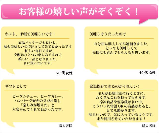 ・ビーフカレー中辛 200g(1人前)×2個 ・ビーフシチュー 200g(1人前)×2個 ・ハヤシ 200g(1人前)×2個 ・煮込みハンバーグ 220g(1人前)×2個 |
