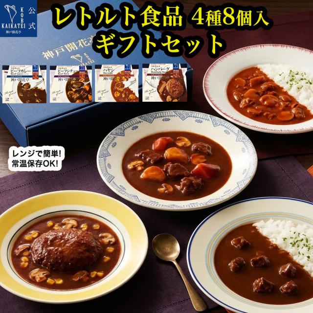 レトルト食品 詰め合わせ ギフト ハンバーグ カレー ビーフシチュー ハヤシ 4種8食 セット 神戸開花亭 洋食 惣菜 常温保存 レンジ対応 温めるだけ 食品ギフト 内祝い 御祝 出産祝い 快気祝い お返し 贈答用 保存食 備蓄 送料無料