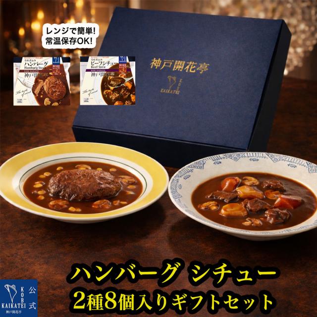 レトルト食品 詰め合わせ ギフト ハンバーグ ビーフシチュー 2種8食 セット 神戸開花亭 洋食 惣菜 常温保存 レンジ対応 温めるだけ 食品ギフト 内祝い 御祝 出産祝い 快気祝い 贈答用 一人暮らし 仕送り 保存食 備蓄 送料無料