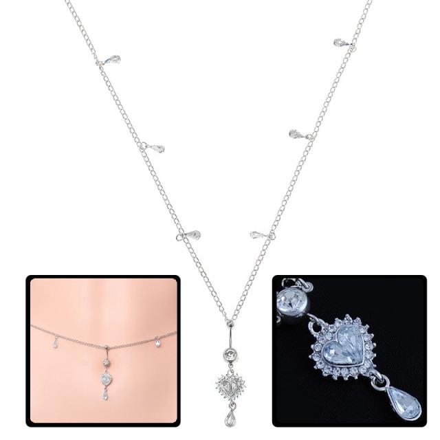 キラキラクリスタルの透明のキュービックジルコニアのハートのチャームと涙型のティアードロップ型のチャームが揺れる女の子に人気のヘソピアスをシズク型ティアドロップチャームが揺れる銀色シルバーチェーンのウエストチェーンにセットしたセクシーなボディチェーン臍ピアスセット。女性に人気のナベルチェーンのセットはプレゼントにも最適のボディーピアス。レディースアクセサリーの人気へそピアスは、へそピあすぉゴージャスに見せてくれる大人のアクセサリー。。腰の括れを強調させてくれるウエストチェーンはスタイルを細く見せるおしゃれなボディチェーン。ベリーチェーンやダンスをする人にもおすすめ。