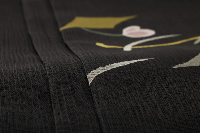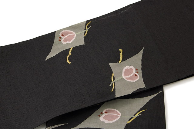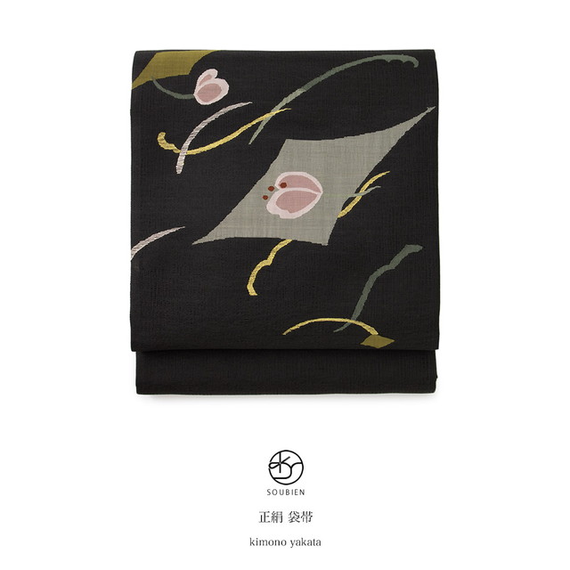 【未仕立て】袋帯 黒 ブラック 流水 花 綴織 正絹 お太鼓柄 カジュアル 夏向き