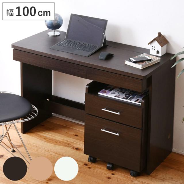 パソコンデスク 幅100cm デスクワゴン付き ワークデスク シンプル ( シンプルデスク 机 つくえ 書斎デスク 書斎机 コンパクト 奥行44.5cm スリム キャビネット 収納 引き出し デスクワゴン デスクセット 省スペース A4 )