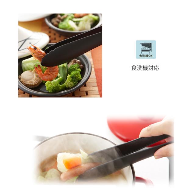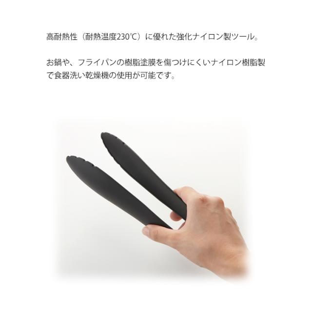 麺類の他、崩れやすい食材もやさしくつかめるナイロン製キッチンツールです。グラスファイバー30%含有の高耐熱性(250度)に優れた強化ナイロン製ツール。鍋・フライパンの樹脂塗膜を傷つけないナイロン樹脂製ツールです。オールナイロン製の継ぎ目のない洗いやすい形状で衛生的に使えます。食器洗い乾燥機の使用が可能です。