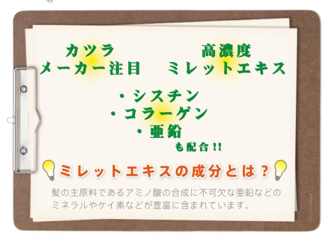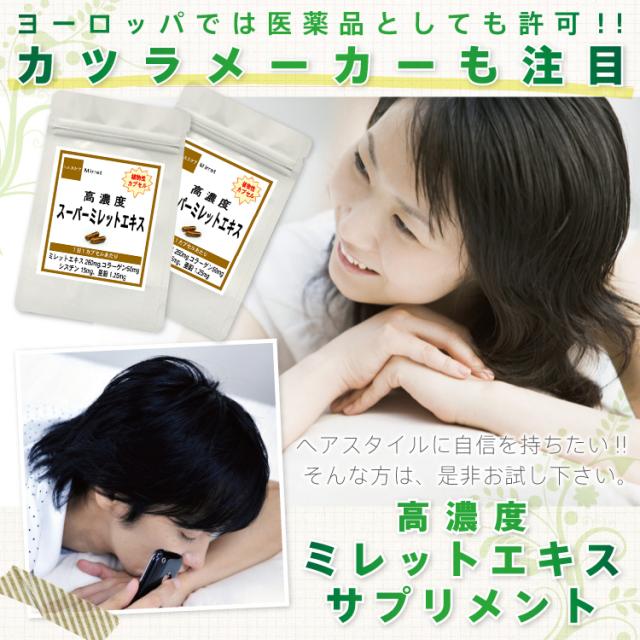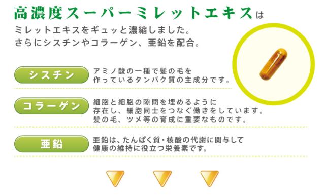 | 1日あたりの摂取量 | ミレットエキス;260mg、コラーゲン;50mg、シスチン;15mg、亜鉛酵母;5mg(亜鉛;1.25mg) |