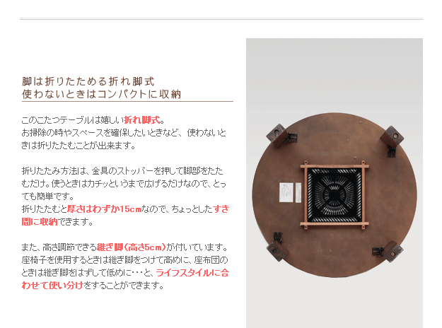 昔ながらのちゃぶ台がこたつになりました☆シンプルなデザイン。こたつもテーブルもこれ1台でOK♪使わないときは折畳んですき間へ収納。薄型石英管ヒーター(600W・手元コントローラー式)。便利な継ぎ脚付(高さ5cm)。