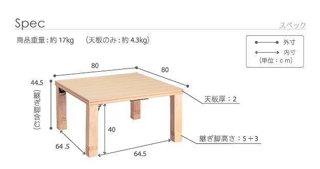 サイズ(cm):幅80x奥行80x高さ44.5cm(36.5+継ぎ脚5cm+継ぎ脚3cm)・約17kg