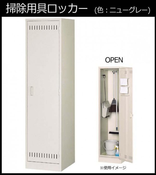 ほうきやモップなど背の高い掃除用具から雑巾・洗剤・バケツなどの小物類まで☆掃除用具の収納に最適なロッカーです。インテリアに馴染みやすいカラー(ニューグレー)は、オフィスや店舗などへの設置にピッタリ☆ |