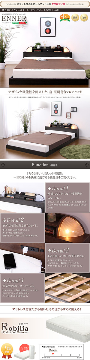 ベッド ダブル ローベッド ロータイプ 低い 低床 宮付き ヘッドボード 枕元 棚 携帯 スマホ ティッシュ メガネ リモコン ラック ライト 読書 木製 北欧 高級 コンセント 充電 おしゃれ モダン メンズ デザイナーズ 照明 読書灯 ポケットコイル マットレス付き 黒木