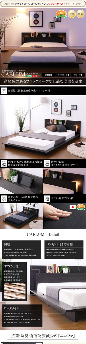 ベッド シングル ローベッド ロータイプ 低い 低床 宮付き ヘッドボード 枕元 棚 携帯 スマホ ティッシュ メガネ リモコン ラック ライト 読書 コンセント 充電 木製 北欧 高級 おしゃれ モダン メンズ デザイナーズ 照明 読書灯 ポケットコイル マットレス付き 黒木