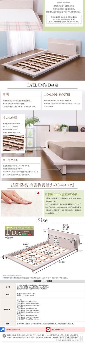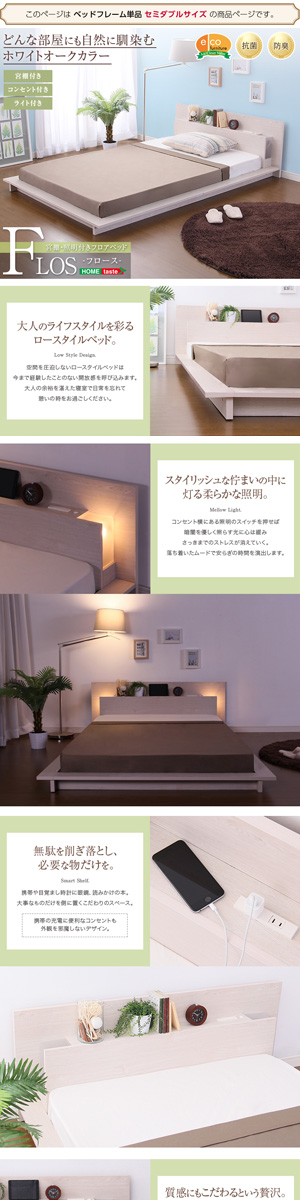ベッド セミダブル ローベッド ロータイプ 低い フロアベッド 低床 宮付き ヘッドボード 枕元 棚 携帯 スマホ ティッシュ メガネ リモコン ラック ライト 読書 コンセント 充電 木製 北欧 高級 おしゃれ モダン ヴィンテージ メンズ 照明 読書灯 白木 収納