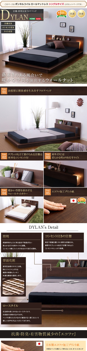 ベッド シングル ローベッド ロータイプ 低い 低床 宮付き ヘッドボード 枕元 棚 携帯 スマホ ティッシュ メガネ リモコン ラック ライト 読書 コンセント 充電 木製 北欧 高級 おしゃれ モダン ヴィンテージ メンズ 照明 読書灯 ボンネルコイル マットレス付き