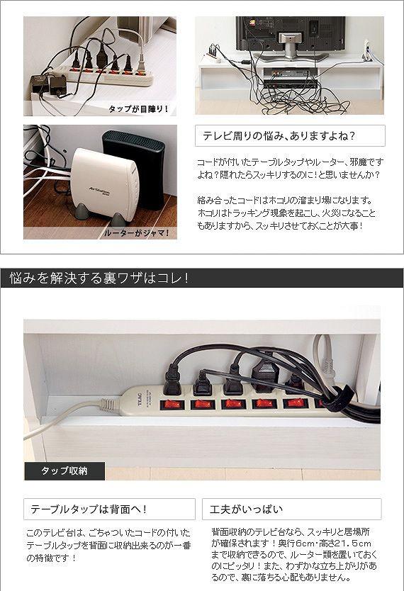 背面収納タイプのTVボード。背面にはコード収納スペースがあり、コンセント類や配線をすっきりとまとめられます。キャスター付きで配線作業、お掃除はラクラク。可動棚板1枚付き。天板耐荷重50kg、テレビサイズ目安37V型まで