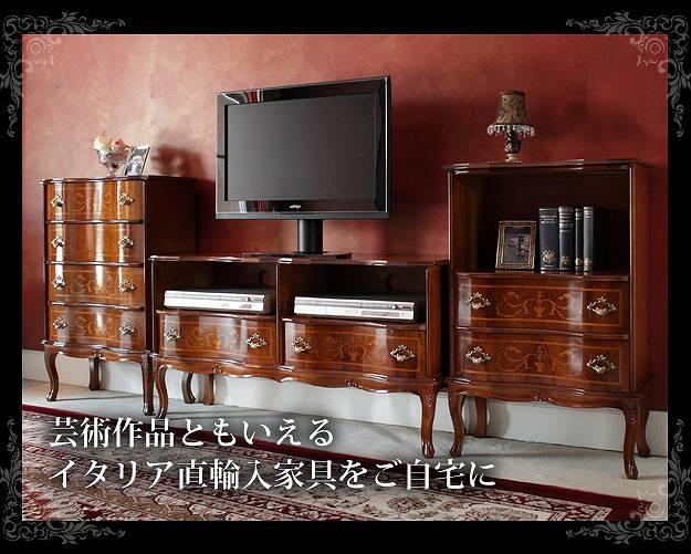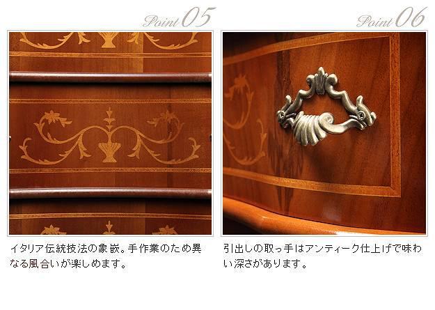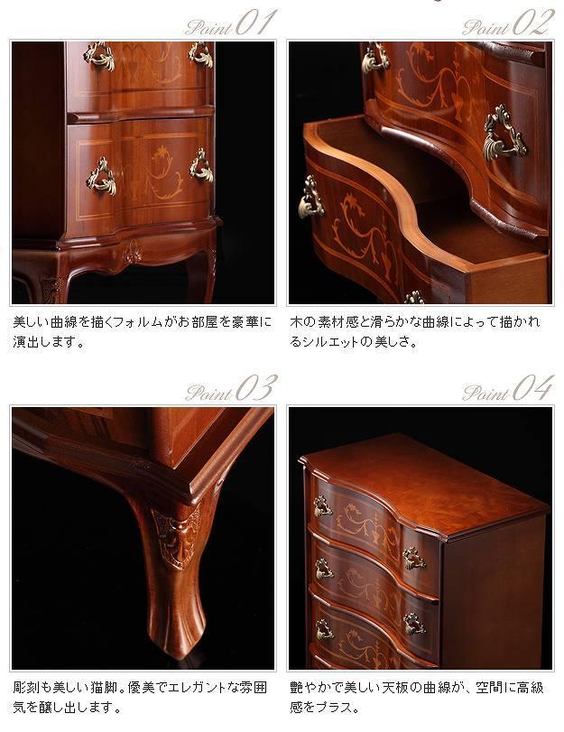 芸術作品ともいえるイタリア直輸入家具をご自宅に☆クラシック猫脚4段チェスト幅58cm。艶やかな色合いと、滑らかな曲線を描くフォルムがお部屋をエレガントに演出します。彫刻が美しい猫脚も魅力的。引き出しの前板にはイタリア伝統の職人技である象嵌細工が施されています。