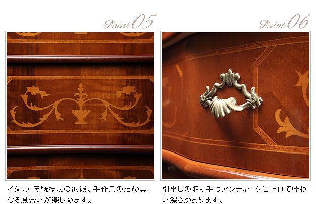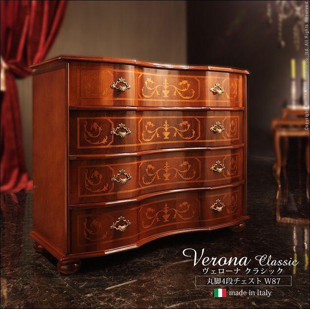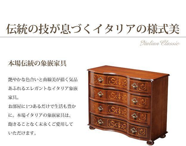 芸術作品ともいえるイタリア直輸入家具をご自宅に☆クラシック丸脚4段チェスト。艶やかな色合いと、滑らかな曲線を描くフォルムがお部屋をエレガントに演出します。引き出しの前板にはイタリア伝統の職人技である象嵌細工が施されています。