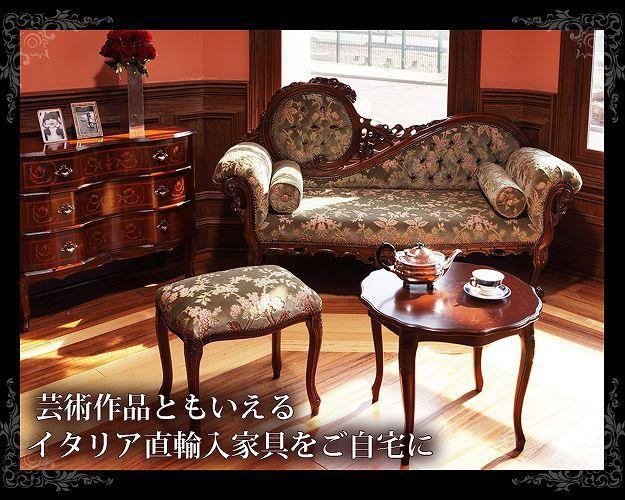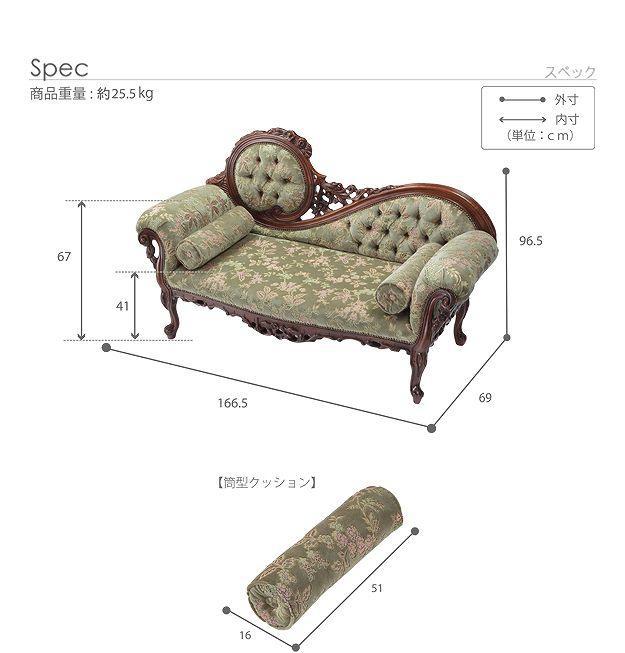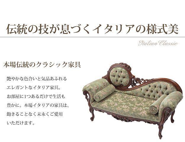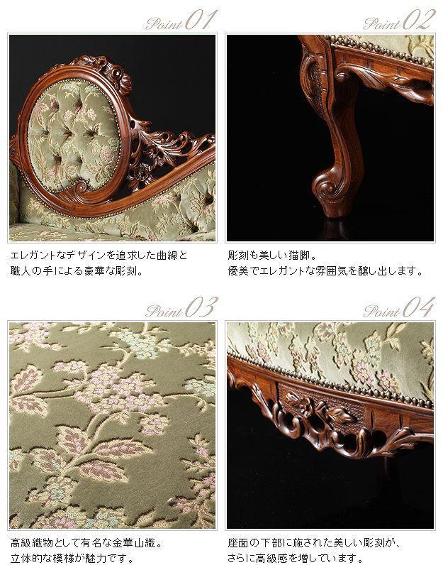 芸術作品ともいえるイタリア直輸入家具をご自宅に☆クラシック金華山カウチソファ。立体感のあるしっとりとした質感の金華山織は華やかで高級感があります。フレームに施された彫刻と美しい猫脚も魅力的。滑らかな曲線を描くフォルムと豪華な金華山織がお部屋をエレガントに演出します。筒型クッション2個付き。