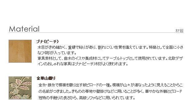 材質:脚部・フレーム-天然木(ビーチ)、ラッカー塗装、張り地(金華山織)-アクリル42%・ポリエステル32%・レーヨン26%、中身-ウレタンフォーム・ウェビングテープ
