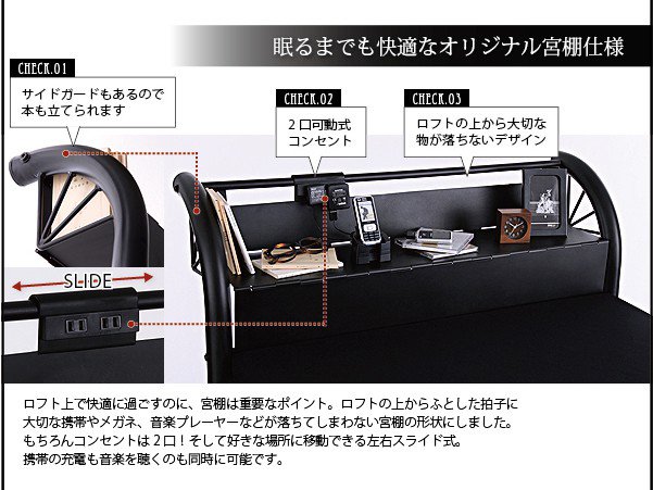 ベッド シングル ロフトベッド パイプベッド 頑丈 丈夫 ハイタイプ ハイベッド 子供 大人用 システムベッド 一人暮らし スペース活用 スチール 高さ調整 調節 ローデスク 宮付 枕元 棚 携帯 スマホ ティッシュ メガネ リモコン コンセント 充電 おしゃれ モダン