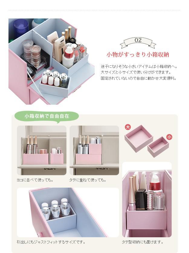 女性スタッフとお客様の声をつめ込んだバイカラーが可愛いメイクボックス。今まで片付けに困っていたメイクアイテムがスッキリと収まります!縦型のボトル収納スペースは背の高いアイテムにも対応。小物は付属の大小2つの小箱へ収納すれば迷子になりません。箱は固定されていないので自由に動かしてカスタマイズ(引出し・縦型収納部にも置けます)できます☆