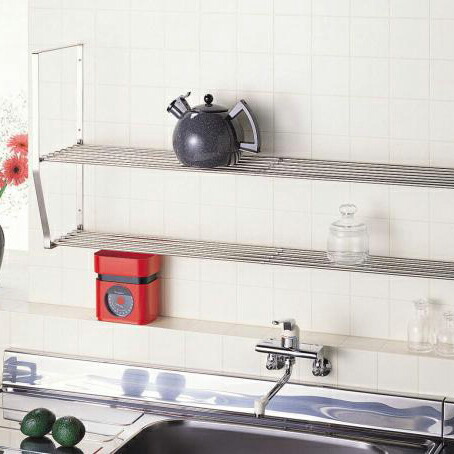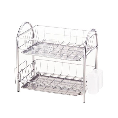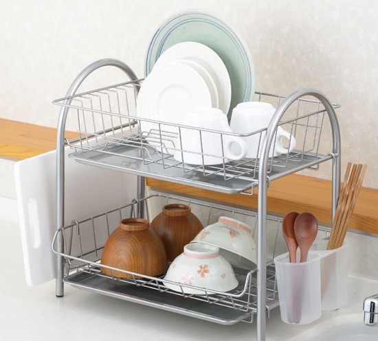 - 以前は枠が木製の二段カゴのものを使用していましたが、上段に水受け皿が無かったので、下の食器が濡れてしまいましたが、これは、安心して置けます。枠組みもおしゃれで、木製のように濡れても黒ずんでしまうことも無いので、永く使えそうで喜んでます! あえて言うなれば、附属のはし、スプーン入れがプラスチック製でなく、同じ金属製ならば良かったかと。 全体的には満足しています。