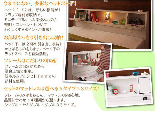 ベッド シングル チェストベッド ミドル ベッド下収納 引き出し 大容量 宮付き 枕元 棚 携帯 スマホ ティッシュ メガネ リモコン ラック ライト コンセント 充電 収納 フレーム おしゃれ アンティーク 姫系 かわいい ガーリー シャビー 照明 読書灯 ボンネルCマットレス付き