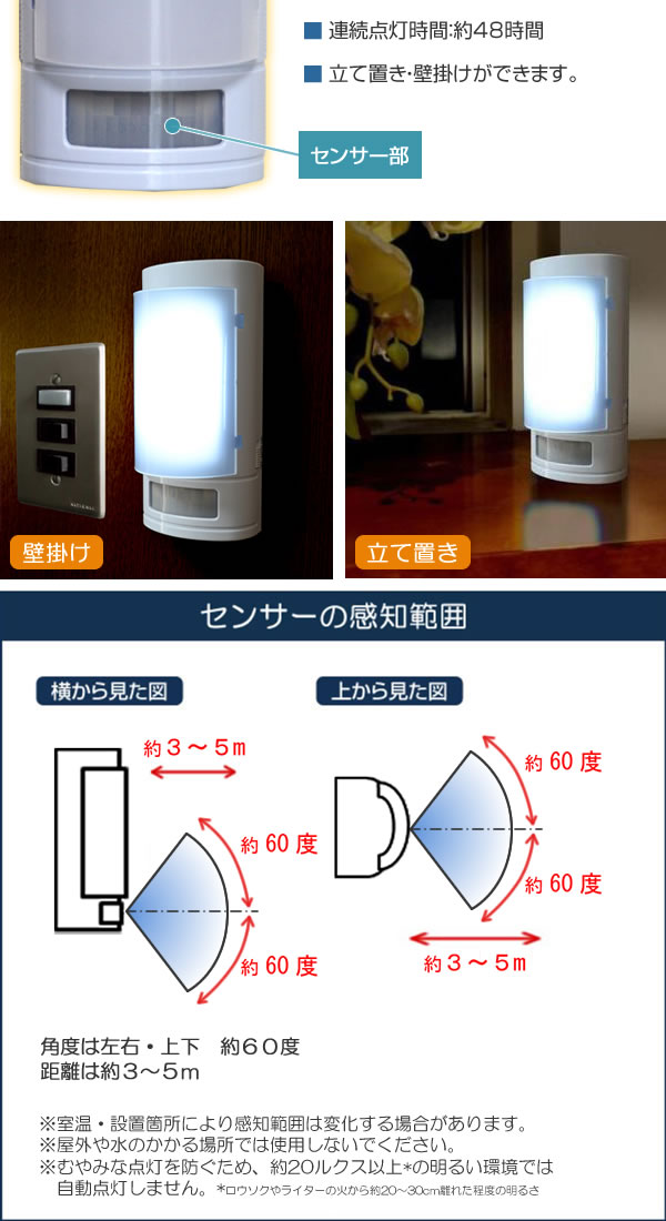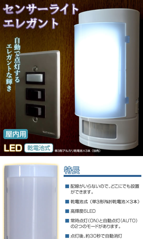 立て置き・壁掛けの2つの使用方法♪室内用高輝度センサーライト!配線いらずでどこにでも置け、センサーが人の動きを感知してLEDのライトがパッと自動で点灯☆常時点灯と自動点灯にスイッチで切り替えが可能★ サイズ/約縦16.7×横8.0×厚さ5.7cm
