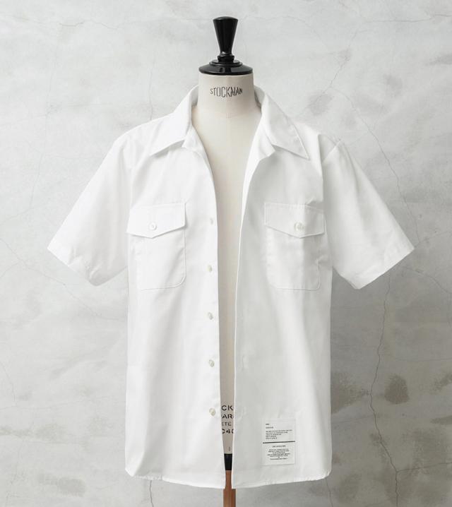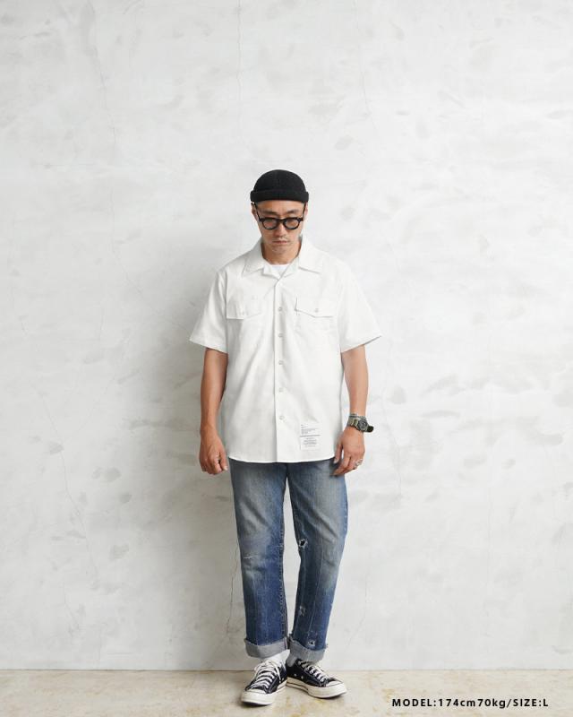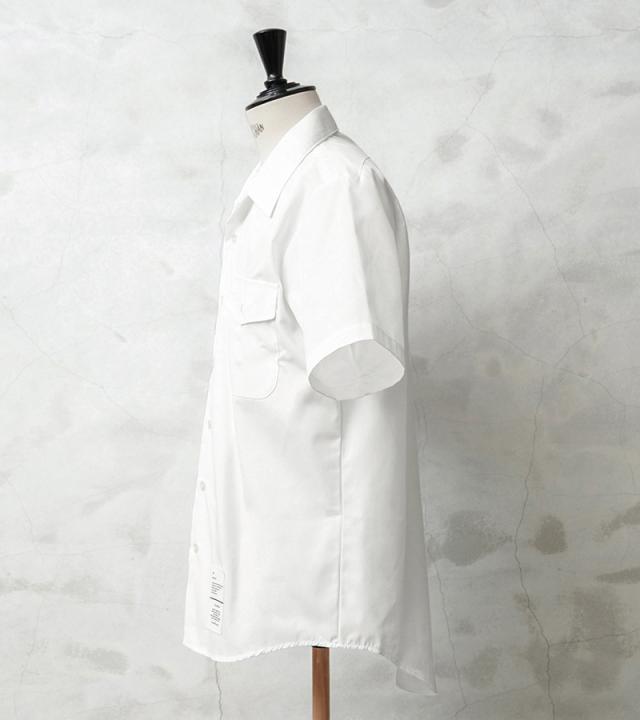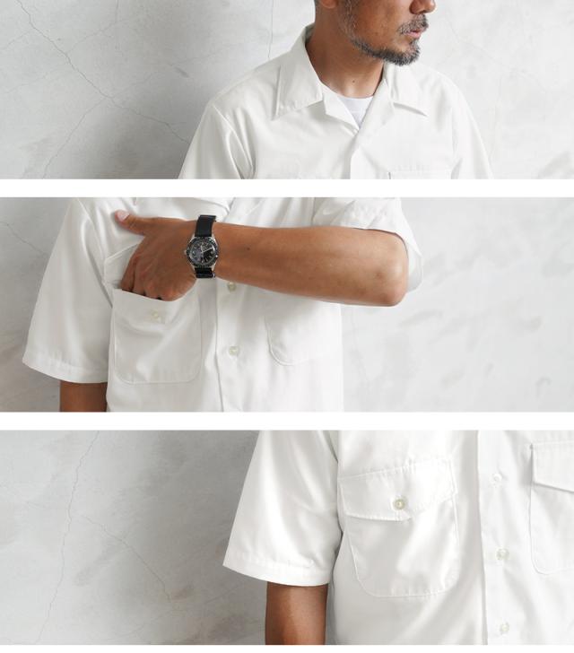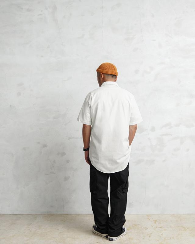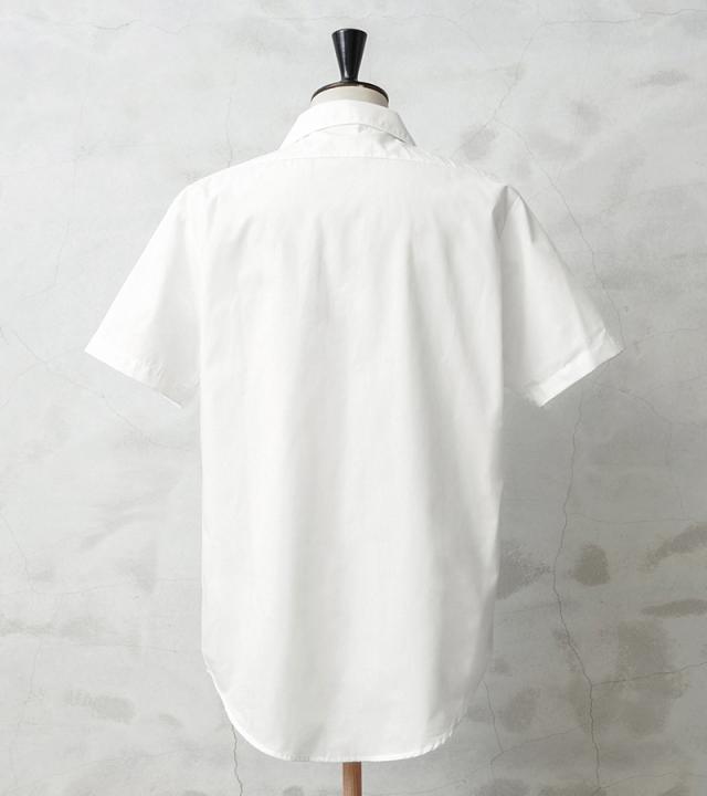 本来は制服などの下に着用したり、夏にはこれ一枚で勤務するためのシャツだったので、素材には通気性・吸湿性の良いポリコットンを採用。マットでシャリ感のある肌触りは涼しげな印象を与え、また丈夫でシワになりにくいのでぜひ暑い季節のワードローブにおすすめの一枚です。