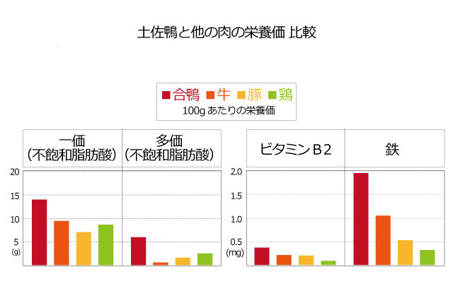 合鴨肉には、不飽和脂肪酸の体内でDHAに変わるα-リノレン酸を多く含有しています。 血中コレステロールを下げ、生活習慣病予防に役立つと言われています。