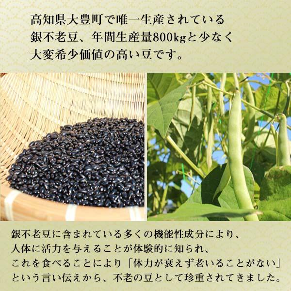 銀不老豆と、年間生産量が約800kgと少ない、大変希少価値の高い豆 です。銀不老豆に含まれる多く機能性成分により、人体に活力を与えることが体験的に知られ、これを食べることにより体力が衰えず、老いる ことがないという言い伝えから、「不老の豆」として珍重されてきました。 毎年、収穫時期に 日本一 大杉がある八坂神社にて銀不老豆を食さ れる、お客様の健康と不老長寿の祈願祭を行っています。