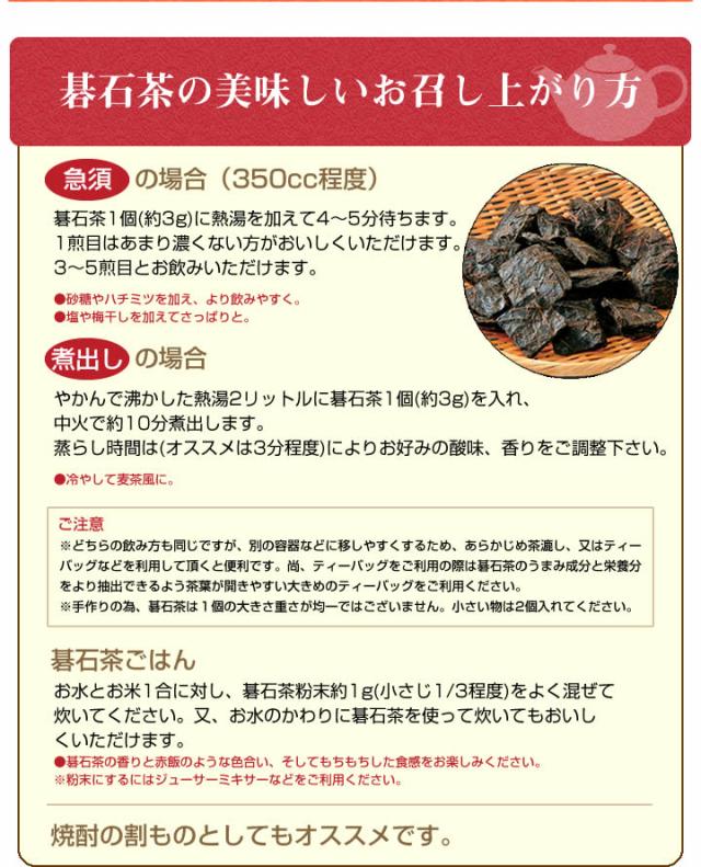 商品説明:やかんで沸かした熱湯2リットルに碁石茶1個(約3g)を入れ、中火で約10分煮出します。