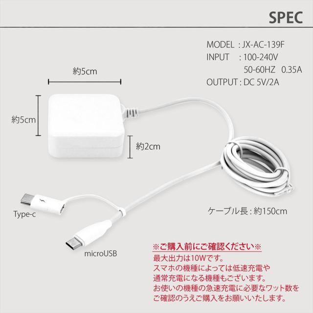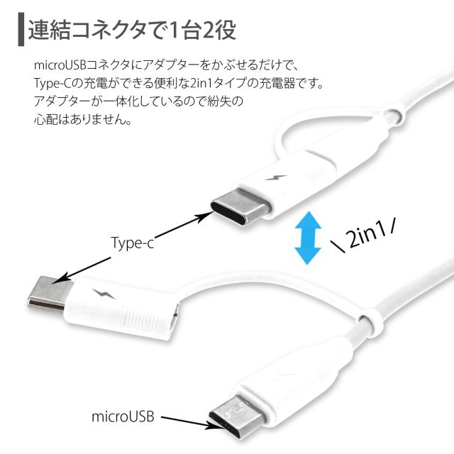 Type-C microUSB 充電器 スマホ ACアダプター 急速充電 2in1 AC充電器 2.0A 10W 1.5m タブレット 家庭用 タイプc 家庭用コンセント コンセント 両面挿し type-cコネクタ 折りたたみ コンパクト 一体化 PSEマーク