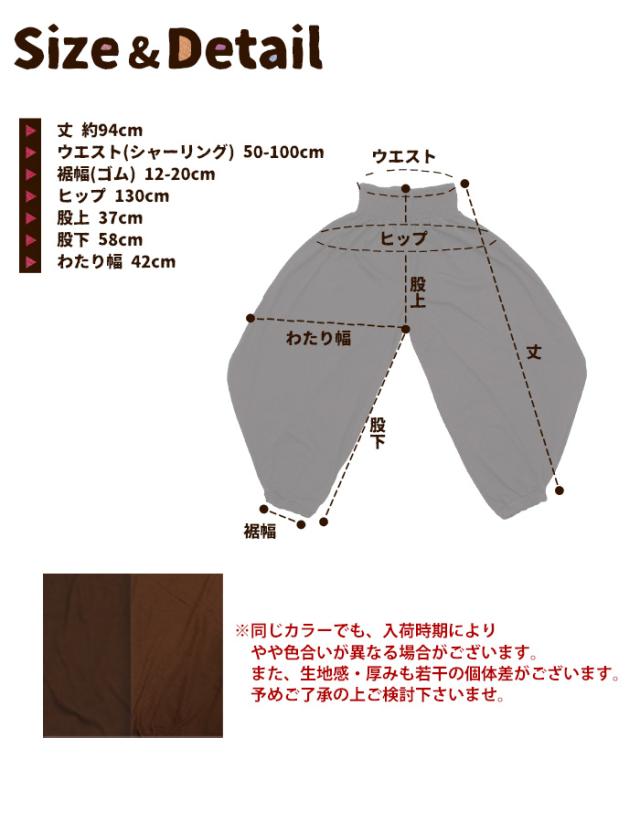 丈 94cm ウエスト (シャーリング)40-88cm 裾幅 (ゴム)12-20cm ヒップ 130cm 股上 37cm 股下 58cm わたり幅 42cm