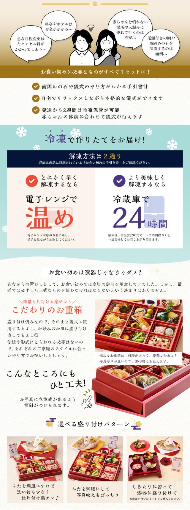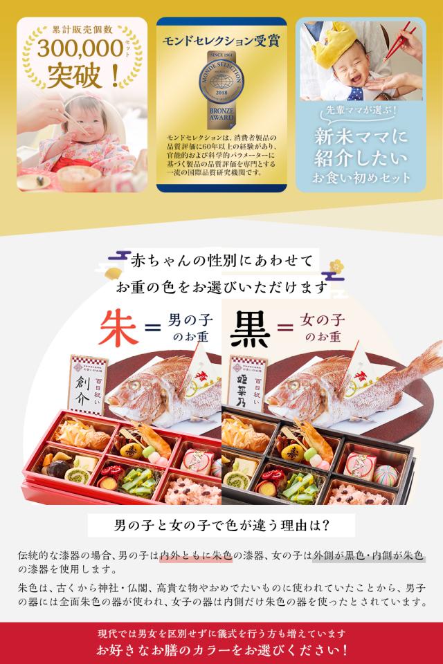 - 爺さんから孫のお食い初めに。2年前の1人目に続き2人目にも購入。金額もそのままでとても良い内容です。盛り付けも簡単でした。