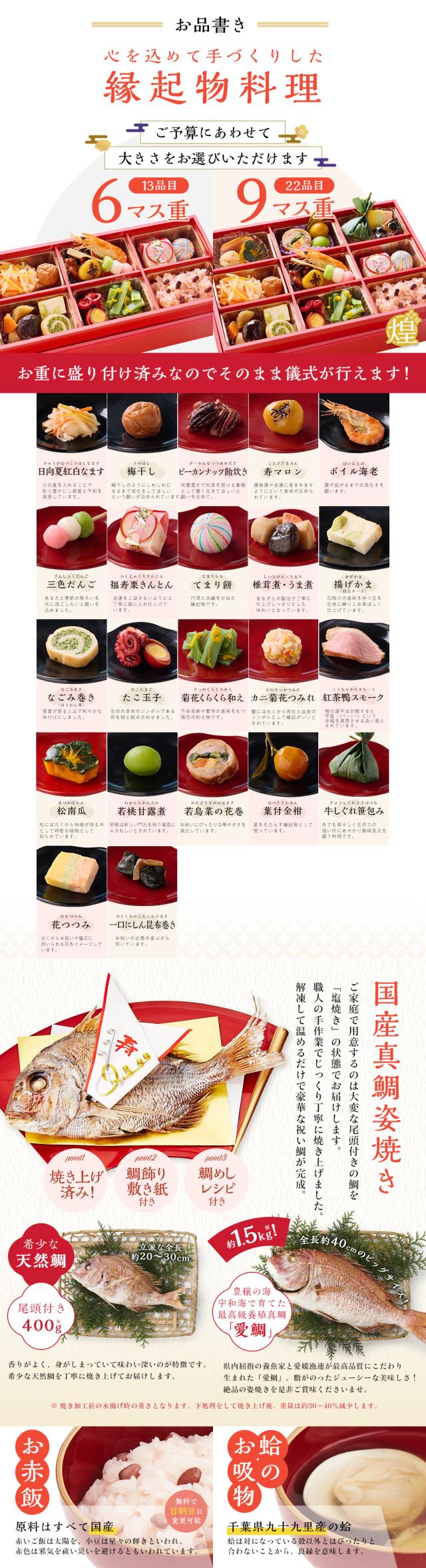 | 原材料 | ●お食い初め膳6マスは別途資料参照 ●鯛:真鯛、塩(※季節や漁獲量によっては異なる調味料[酒、醤油、穀物酢、ベニコウジ色素、(原材料の一部に大豆、小麦を含む)]を使用する場合がございます) ●赤飯[小豆]:もち米(国産)、小豆(国産)、食塩、着色料 ●赤飯[甘納豆]:もち米(国産)、甘納豆[砂糖、小豆(国産)、還元水飴]、食塩、着色料 ●蛤:千葉県九十九里産はまぐり1粒約35g ●お吸い物:約2.5g、食塩、麩、ねぎ、のり、調味料(アミノ酸等)、香料 ●歯固め石:新那智黒石(自然玉)磨きタイプ 約3〜4cm ※天然石の為大きさや形に個体差があります ●祝箸:【箸袋】無蛍光奉書/【箸】柳 |