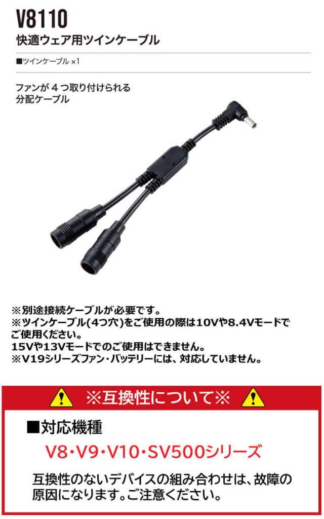 [在庫限り][即日発送]ファン付き作業着 快適ウェア HOOH 村上被服 快適ウェア専用ツインケーブル V8110 V13シリーズ専用