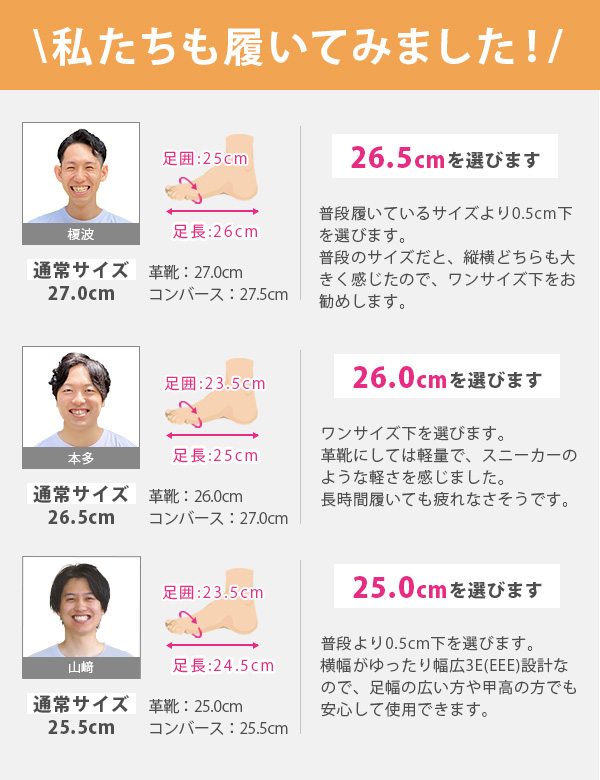 幅広設計なので、甲高・幅広の方も0.5cm小さいサイズをオススメします。
