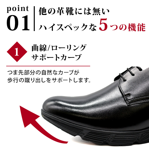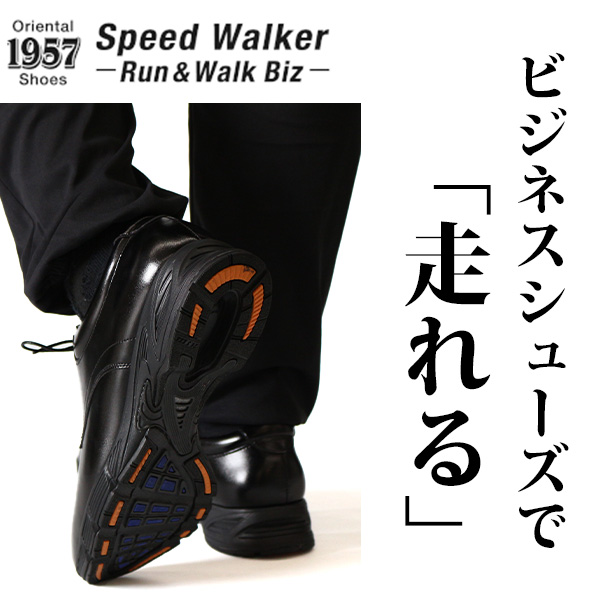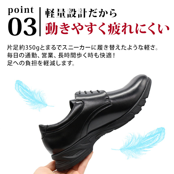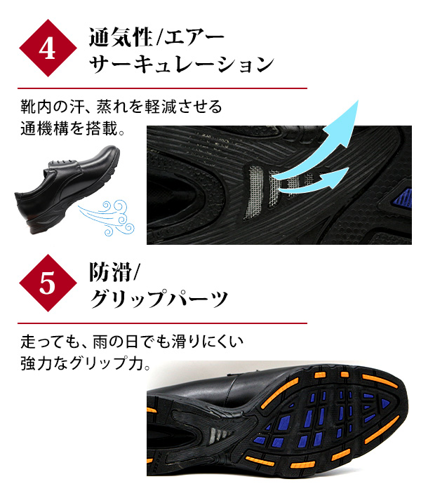 ・運動不足の現代人のための革新的シューズが登場。走れるビジネスシューズ ・靴底はスニーカーのグリップ力を再現。少しの斜面や濡れた路面でも安心の滑りにくさ。 ・片足約350gと軽量な設計。足への負担が少なく、長時間履いても疲れません。 ・防滴仕様で、突然の雨でも安心。エアーサーキュレーション搭載で蒸れ知らずです。