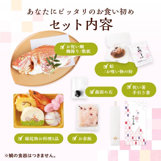 飾り付きのお祝い鯛、お赤飯、蛤のお吸い物、祝箸、歯固め石、お食い初めに必要な基本セットに、
