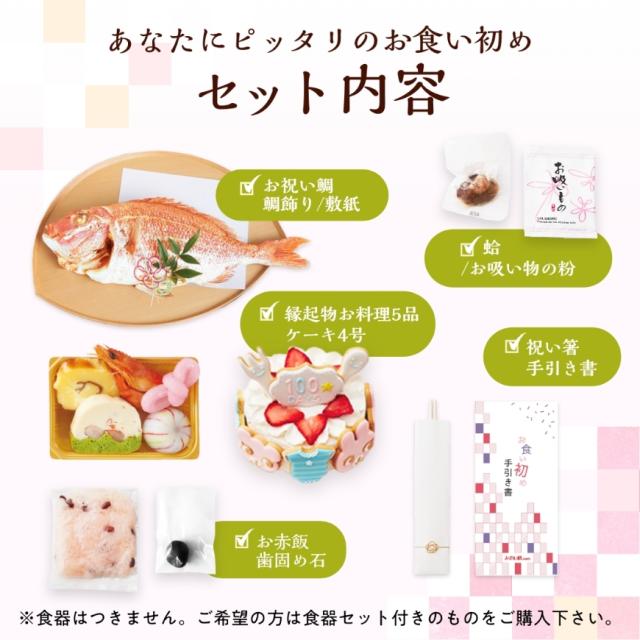 | 内容量 | ●祝い鯛姿焼き(水揚げ時加工前1.5kg / 下処理焼き加工後800g)×1 ●縁起物お料理5品×1 ●お赤飯×1 ●蛤×1 ●お吸い物の素×1 ●生クリーム4号ケーキ(直径約12cm)×1 ●アイシングクッキー8枚 ●歯固めの石×1 ●祝い箸×1 ●鯛飾り×1 ●敷き紙(白)×1 |