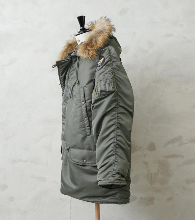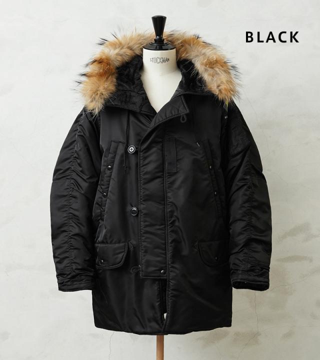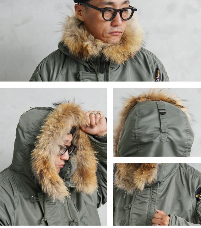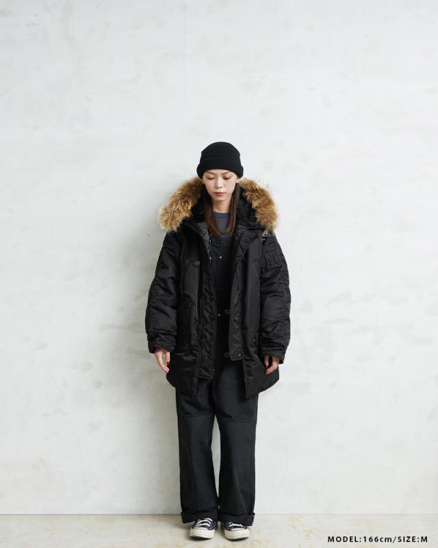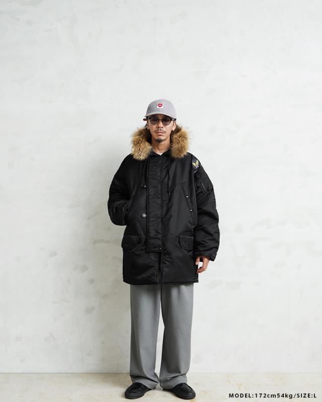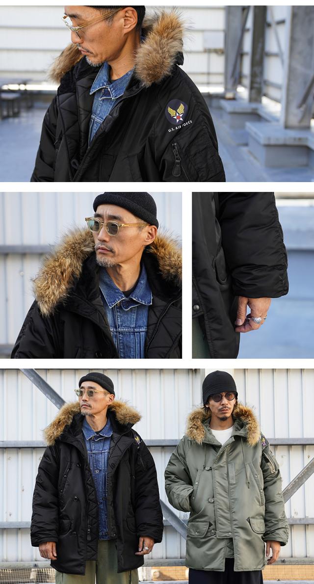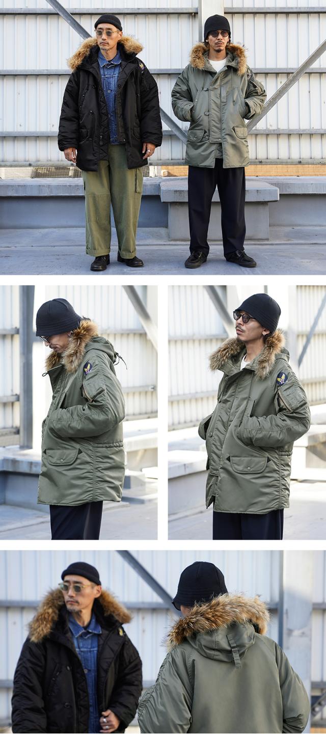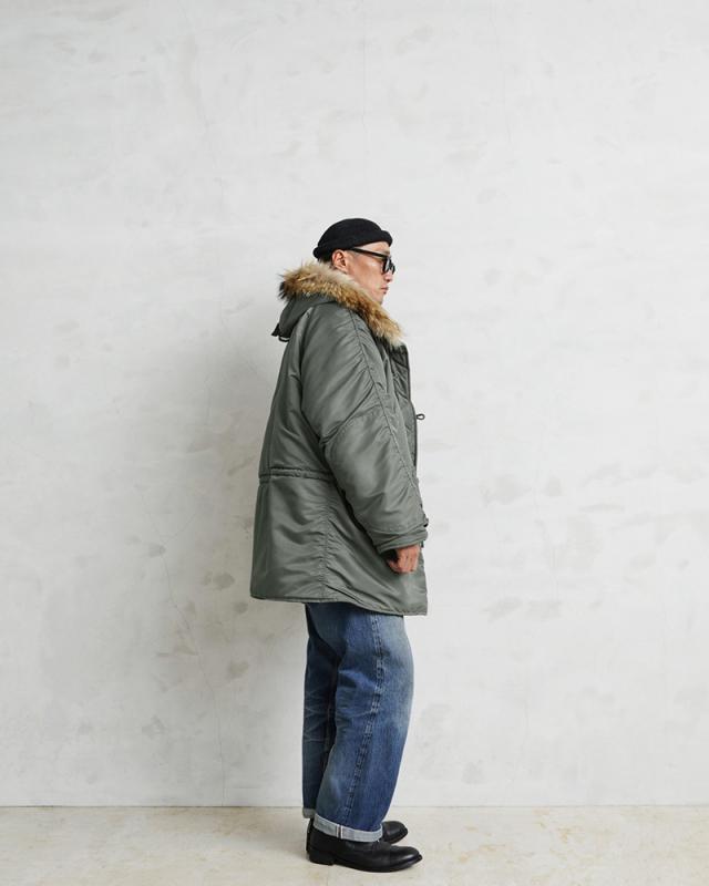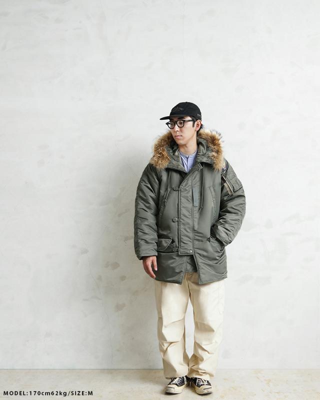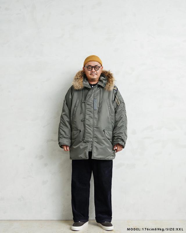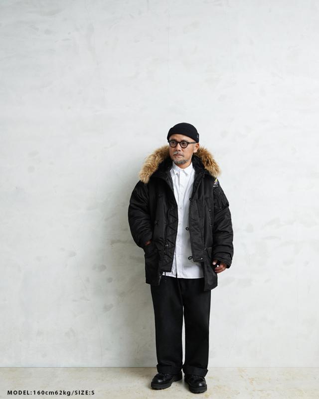 | 商品説明 | WAIPER.inc 米軍 初期型 N-3B VINTAGE フライトジャケット リアルファーのご紹介です。 品番:WP21 品名:JACKET,AIR CREW,HEAVY ATTACHED HOOD,TYPE N-3B N-3Bは1948年にアメリカ空軍採用されたエアクルー(搭乗員)用のジャケットで、現在も限定的ながら使用され続けている、ミリタリージャケットの生き字引のような存在です。 そのN-3Bを素材やフォルムにこだわり、本物が持つ魅力に最大限近づけたN-3Bフライトジャケットが完成しました。モデルは胸のジッパー横にボックスタブが付き、フロントボタン4つの初期型です。 実物のゆったりとしたサイズ感を踏襲しつつ、デイリーコーデに取り入れやすく調整した絶妙なシルエット。N-3Bならではの、しっかりと包み込まれるような存在感のある一着です。 フードファーは上質な物のみを厳選した、非常にボリュームのあるラクーンファーを使用。左袖上部のU.S.AIR FORCEのデカールプリントが特徴です。 ラグランスリーブのアームにはパッカリングのギャザーが入ることで立体感のある仕上がりに。しっとりとした重みのあるナイロンの素材感とも相まって重厚な雰囲気を醸し出します。 圧倒的な防寒性も魅力の一つ。中綿がしっかりと詰まっており、保温性能についてはもはや説明不要だと思います。 ナイロンの中綿アウターとは一味違う、ヘビーデューティーな一着はミリタリーを象徴するジャケットです。 | ||||||||||||||||||||||||