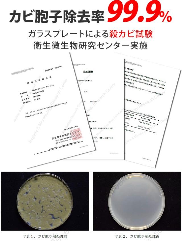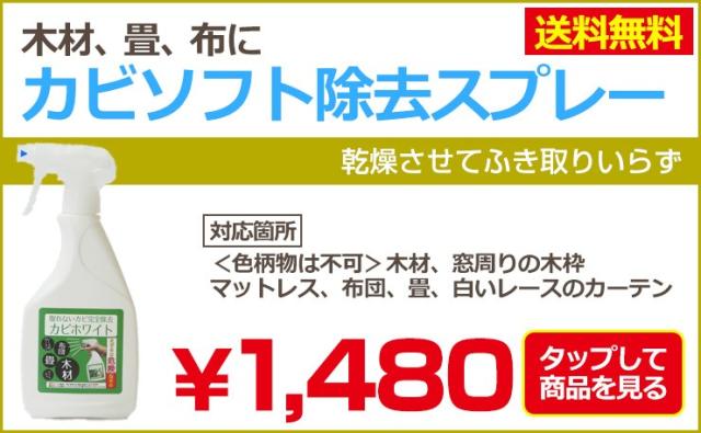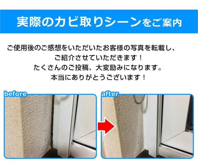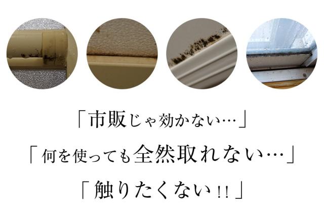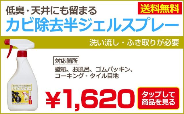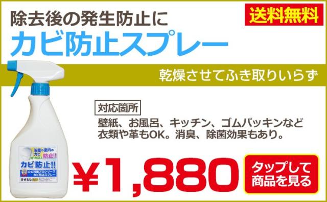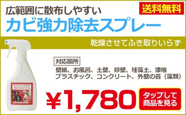 プロも取れないカビが誰でも簡単に取れるカビ取り剤!噴霧して15分程度放置するだけでカビが消滅!作業中の危険度は、市販のカビ取り剤と同等か、それ以下。<カビ対策シリーズのご紹介>【カビソフト除去スプレー】マットレス、窓の木枠、畳などの漂白されやすい個所のカビ取り剤(色柄物不可)。【カビ除去ジェル剤】ゴムパッキン、タイル目地、シーラントのカビ専用のカビ取り剤。【カビ強力除去スプレー】ビニール製の壁紙、ユニットバス、コンクリートなど、漂白に強い個所のカビ取り剤。【カビ防止スプレー】お風呂場のゴムパッキンや浴室、室内のカビを長期間防止できる!革靴や衣類にも使用可能! 【カビ取り&防止ジェル剤】ゴムパッキン、タイル目地、シーラントのカビ取りと同時に1年程度のカビ防止効果あり【カビホワイト ジェルスプレー】ビニール製の壁紙、ゴムパッキンの軽度なカビ、ユニットバス、コンクリートなどのカビ取り剤。低臭タイプで使いやすい。洗い流しか、水拭きが必要なため、広範囲の作業にはカビ強力除去スプレーをご使用ください。