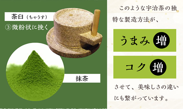 信頼できる京都京丹後の契約農家より厳選した上質の碾茶のみを仕入れ、京都の伝統ある契約工場にて厳選挽き上げました。