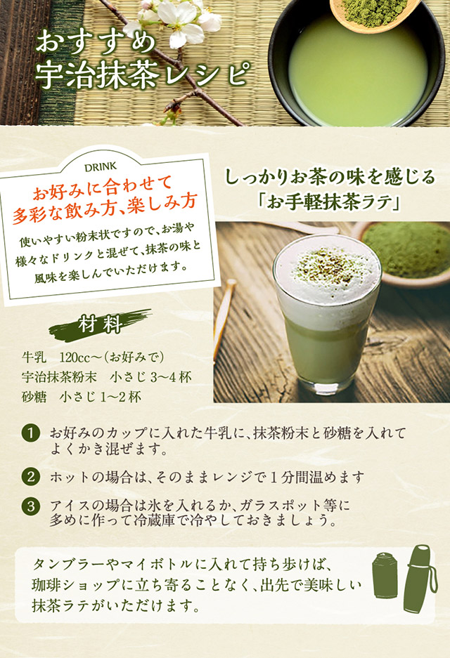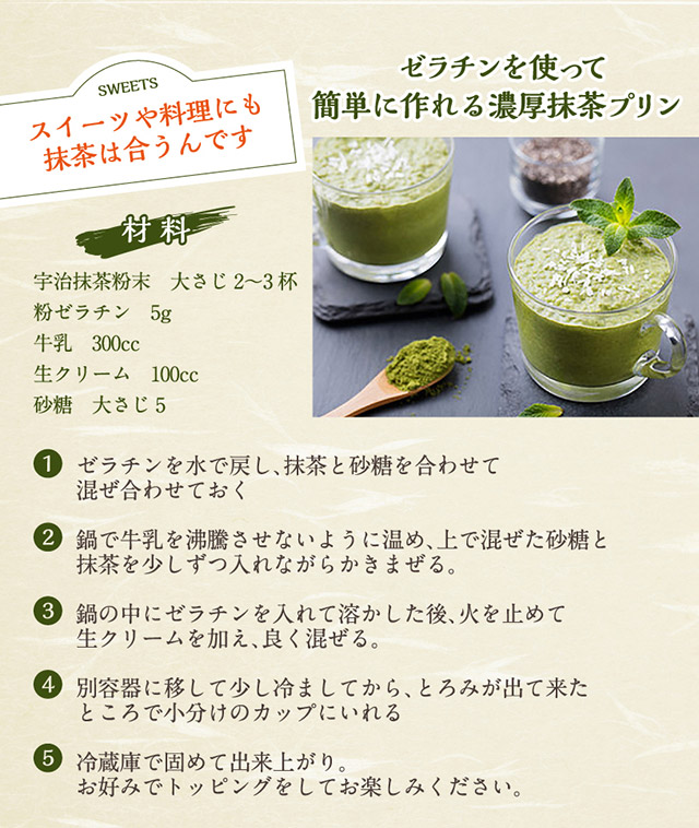 点ててお召し上がり頂く抹茶だけでなく、ドリンク、お菓子、お料理にお使い頂けます。
