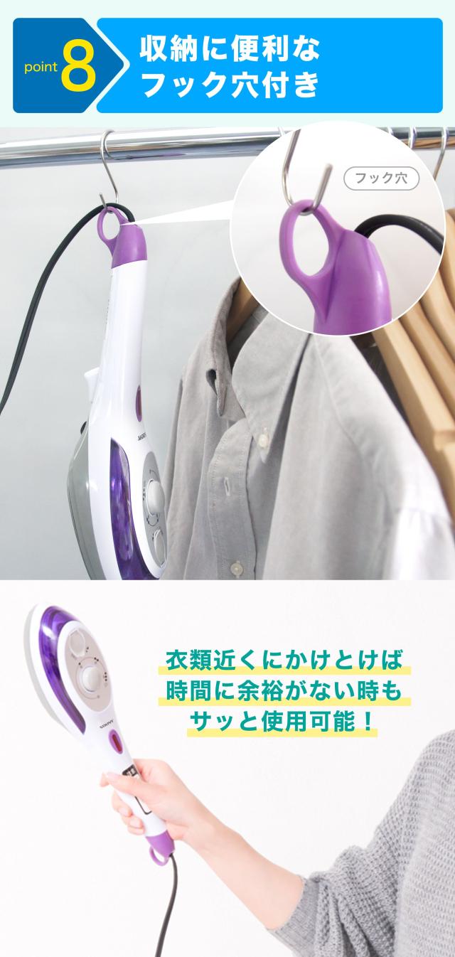 コンパクトでアイロン台不要の衣類スチームアイロンです。ハンガーにかけたままでも、強力なスチームの力で洋服のシワを伸ばす他、嫌な匂いもスチームの力で除去し消臭ができます。また、本体にはアイロン面もあるので通常のアイロンとして使用すれば頑固なシワもしっかり取れる2WAY仕様になっています。便利なフック穴付きなので収納や保管にもとても便利です。小型で旅行先や出張先へ持ち運ぶのにも良い大きさのハンディスチームアイロンです。スチームのほかにもドライアイロンやダニ対策にスチームでソファやぬいぐるみなどにも使えます。