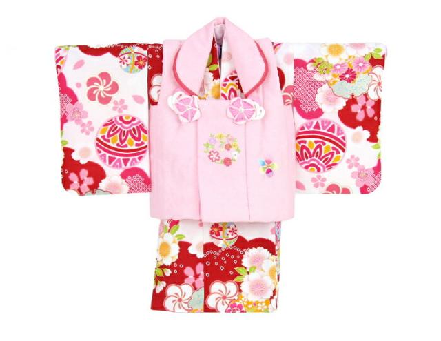 レンタル 女の子 1歳用着物レンタル 「赤・白地に鞠と花輪(被布:ピンク)」