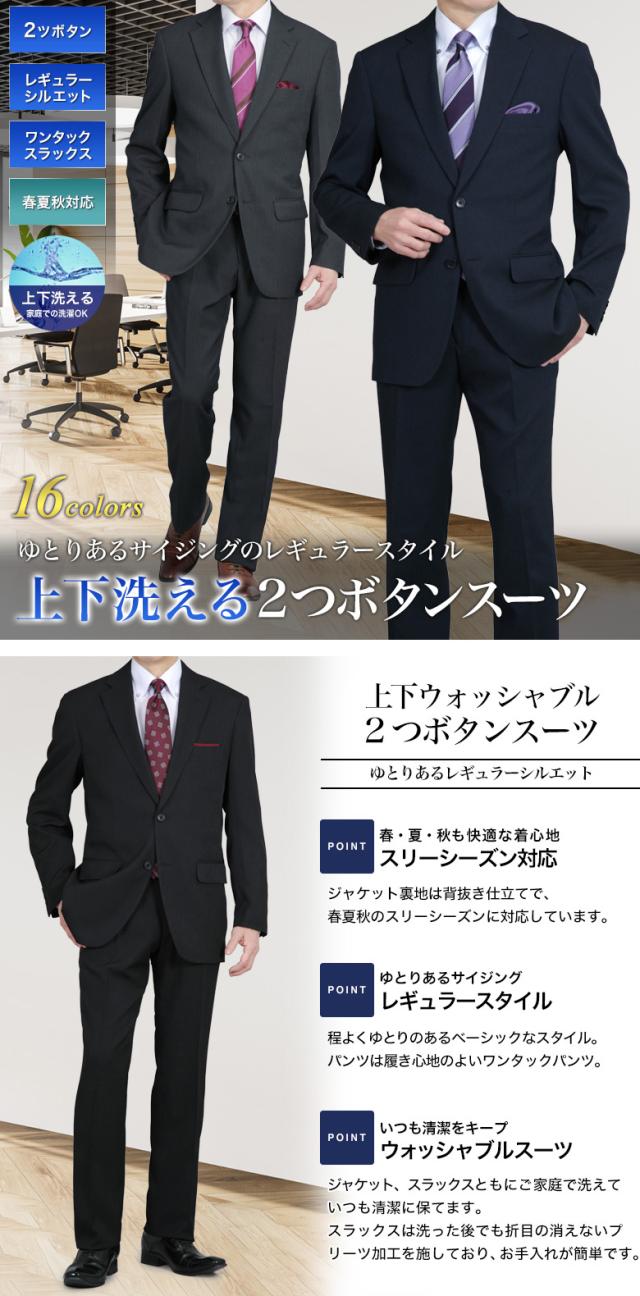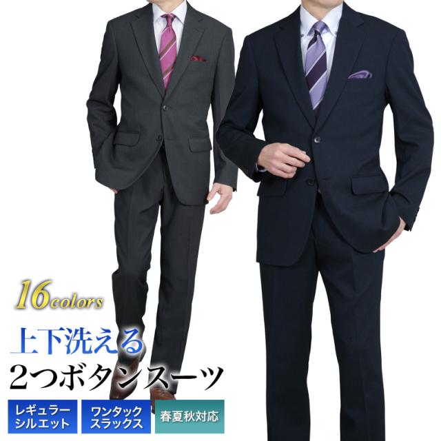 スーツ メンズ レギュラーフィット 2つボタン 春夏秋 ウォッシャブルスーツ 上下洗える ワンタック プリーツ加工 ポリエステル100% ビジネススーツ メンズスーツ