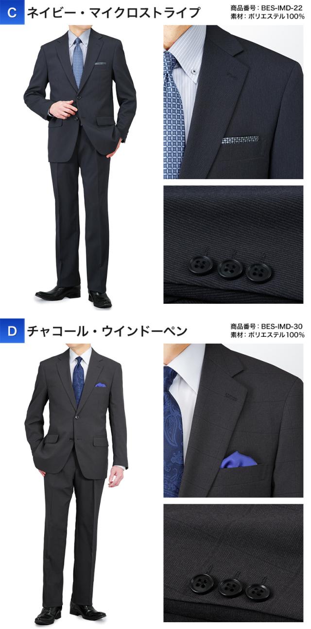 | 【レギュラースタイル・ゆとりあるサイジングのスーツです】 全体にゆとりのあるシルエット、落ち着いた大人のビジネスマンにおすすめです。ジャケットは背抜き仕立てで春夏秋のスリーシーズン対応で長期間ご着用いただけます。スラックスはワンタックでヒップ、腰周りに程よくゆとりのあるすっきりとしたシルエット。長時間のビジネスワークにもストレスを感じさせないシルエットに仕上げております。素材はシワに強く耐久性、速乾性に優れたポリエステル100%素材でお手入れも簡単、メンテナンス、コストパフォーマンスに優れた素材となります。 |